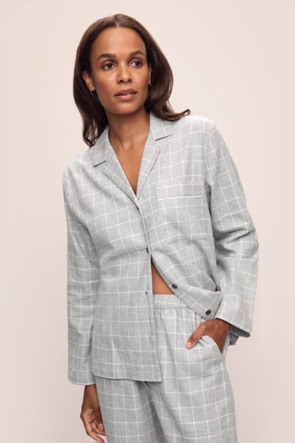 If cozy had a print, this would be it. Crafted from 100% cotton, our flannel is brushed to ensure a super soft feel against the skin, making it easy to wear and hard to take off. Great for classic holiday looks and cabin getaways, this relaxed long sleeve and pant set features a button-down top with a notch collar and functional chest pocket, adding a touch of sophistication to your nighttime routine. The mid-rise straight leg pant offers an everyday fit with its elastic waistband and side pockets. Complete with faux horn buttons and contrast piping on the chest pocket, these PJs are the perfect mix of cozy and stylish. Pair the set with our Ivory Sherpa or Plush Slippers for the ultimate cozy uniform.