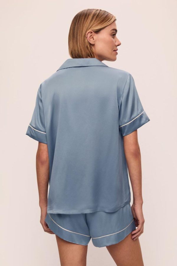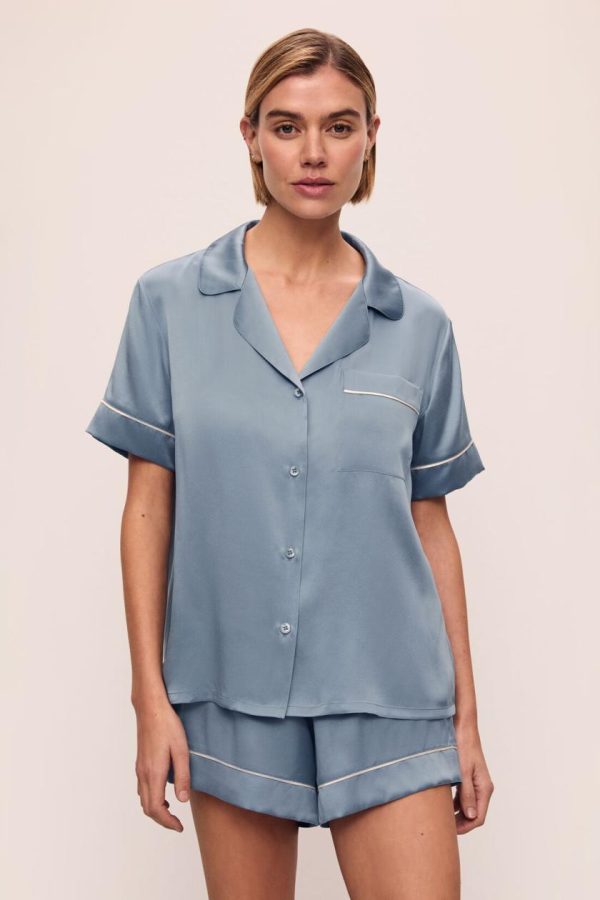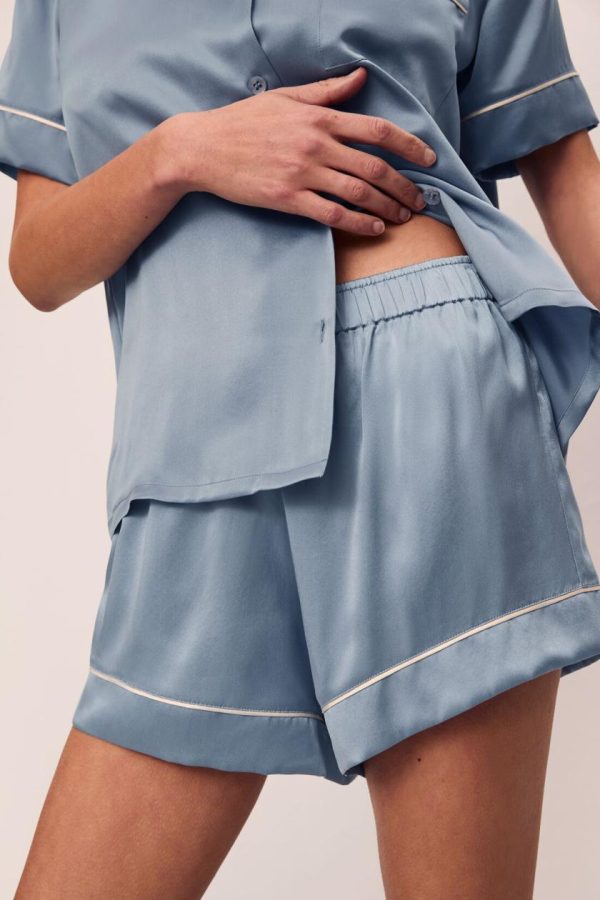 A dream to wear and a dream to wash. Made from 100% mulberry silk, our fabric is produced using bluesign®-certified processes and verified by OEKO-TEX® Standard 100, meaning it is processed without harmful chemicals or dyes in a mill that prioritizes safe and non-toxic practices. It’s hypoallergenic and thermoregulating, offering comfort year-round. This short sleeve set includes a boxy, notch collar button-down top and mid-rise relaxed fit shorts with an elastic waistband. Pairs well with our everyday lingerie and Sherpa Slippers.
